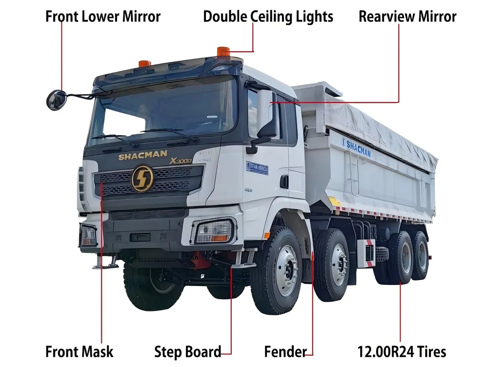 Shacman X3000 6x4 & 8X4 Dump Truck တို့ကအပြား (သို့) အလယ်အလတ်အရှည်အမိုးနှင့်ဒီဇိုင်းပြုလုပ်ထားသော 2490 မီလီမီတာအကျယ်ရှိပြီး, လောင်စာဆီတိုင်ကီကိုလူမီနီယမ်အလွိုင်းဖြင့်ပြုလုပ်ထားသောစွမ်းရည်သည် 300L မှ 600L အထိစွမ်းဆောင်ရည်မြင့်မားစွာဖြင့်လောင်စာဆီထောက်ပံ့ရေးအတွက်ဖြစ်သည်။ ရှေ့ 0 င်ရိုး၏အခွင့်အလမ်းသည် 6500 ကီလိုဂရမ် (သို့) 7000 ကီလိုဂရမ်ရှိပြီးနောက်ဘက် 0 င်ရိုး၏ခွင့်ပြုထားသည့်ဝန်မှာ 18000 ကီလိုဂရမ် (2-axle group) သည် 5.26 မှ 5.92 အထိရှိသည်။ လုပ်ငန်းလည်ပတ်နေစဉ်အတွင်းစွန့်စားမှုကိုလျှော့ချရန်ကုန်တင်အခန်းများကိုချောမွေ့စွာကိုင်တွယ်ဖြေရှင်းခြင်းများကိုချောမွေ့စွာကိုင်တွယ်ဖြေရှင်းခဲ့သည်။ ထို့အပြင် Shacman X3000 6x4 & 8x4 Dump Truck သည် ABS anti-lock braking system, LDWS Lane မှထွက်ခွာရန်သတိပေးစနစ်,